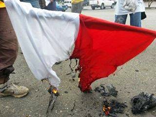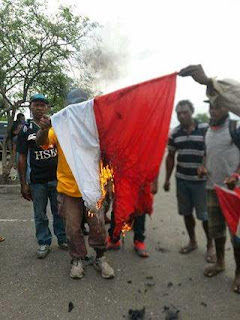 Bendera Indonesia dibakar Warga Papua New Guinea di Bandara International Jackson, Port Moresby. Papua New Guinea saat kunjungan President RI Jokowi ke Papua New Guinea, 12 April 2015