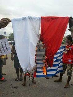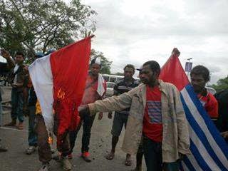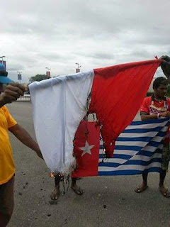 People of Papua New Guinea burn the Indonesian flag at Jackson's international airport in Port Moresby, PNG during the departure of Indonesian president this morning. Free west Papua.